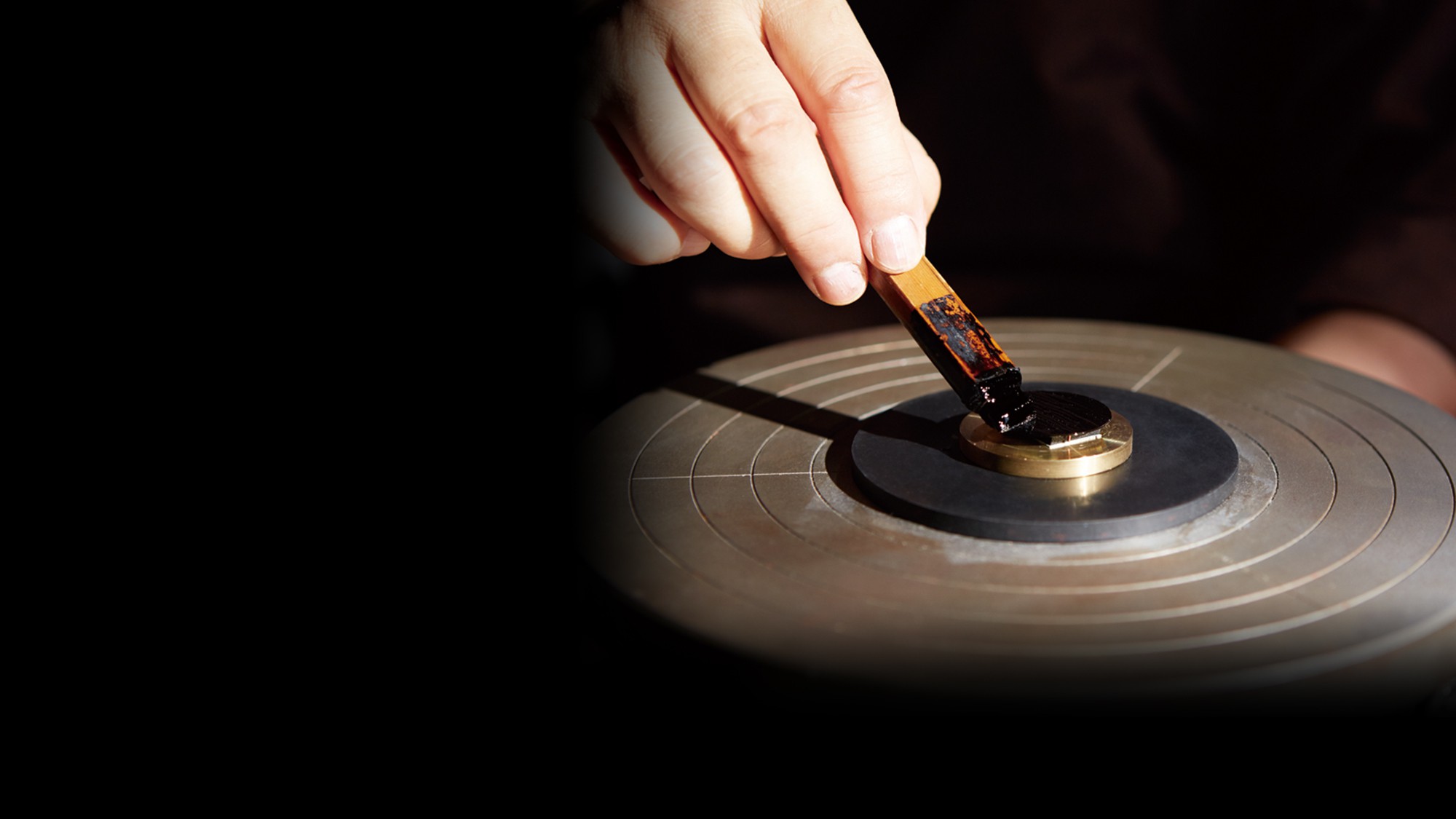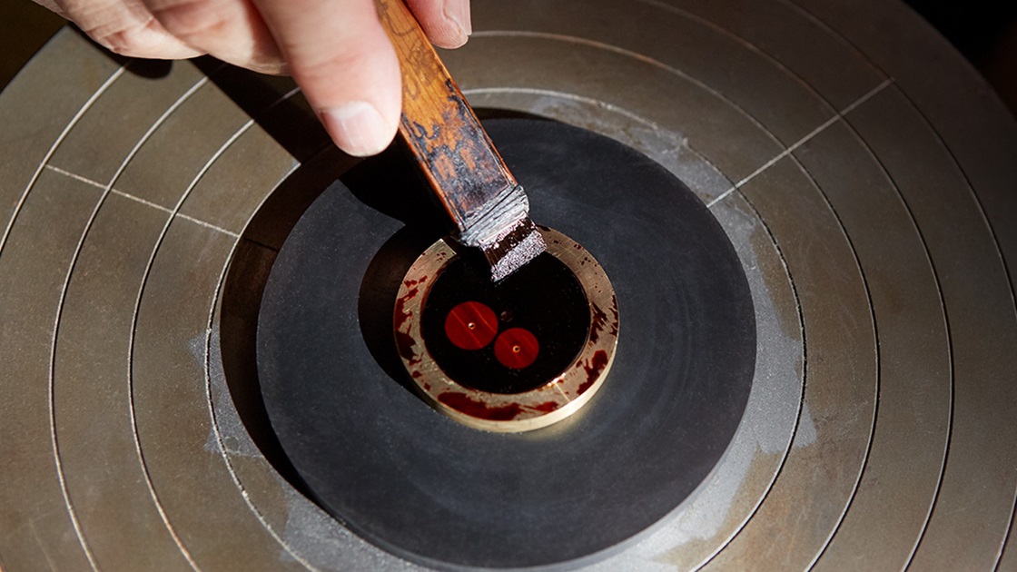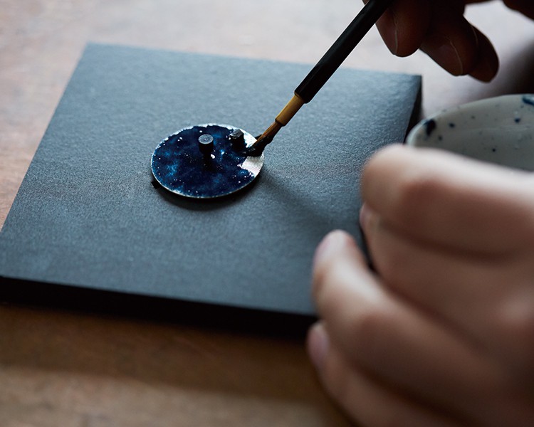 Now it is time to add the moon, using the Maki-e technique, in the form of the crescent shaped power reserve indicator. As with the Byakudan-nuri technique, the crescent is first coated with a layer of Urushi lacquer that acts as the adhesive for the fine, gilt-colored powder that is then applied to it. Once the powder is on the dial, the craftsman gently taps it to disperse the powder evenly across the surface and then uses his own specially chosen material to perfect the surface. The result is an indicator that not only reflects the shape of the crescent moon but has the moon’s shimmering, granular texture and contrasts with the smoothness of the sky against which it stands out.